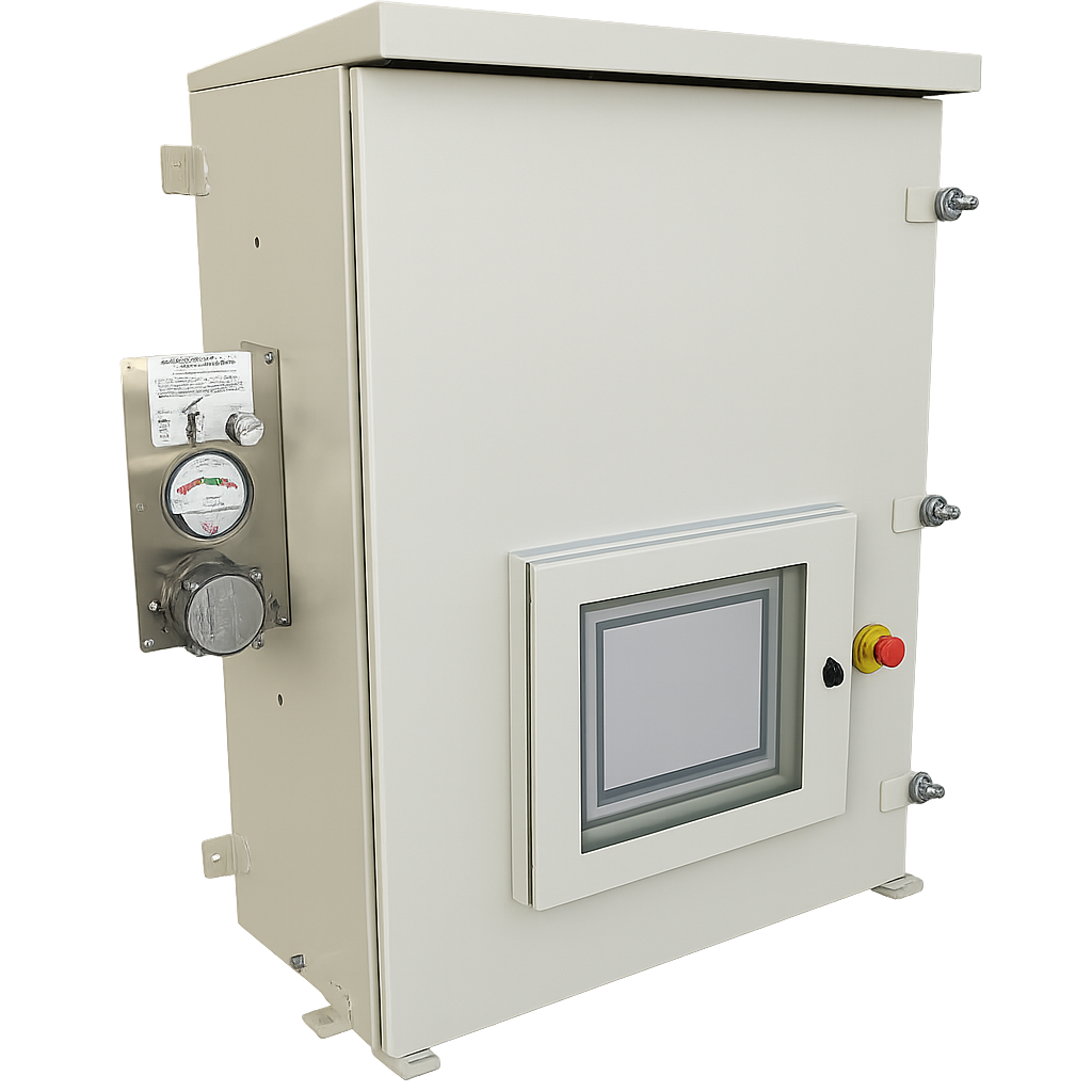 Una vez finalizado este proceso, el sistema mantiene una presión positiva constante dentro del gabinete mediante el ingreso controlado de aire o gas inerte. Esta condición evita que el ambiente exterior ingrese al tablero, garantizando que los componentes eléctricos operen en un entorno seguro incluso cuando el equipo se encuentra instalado en áreas clasificadas.